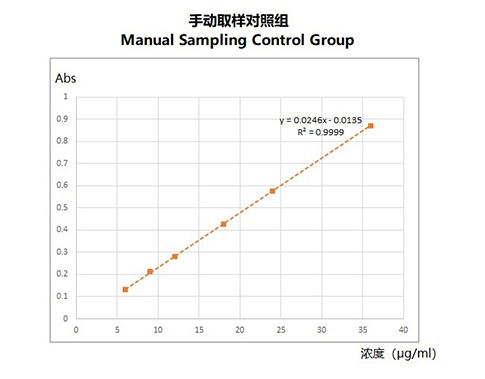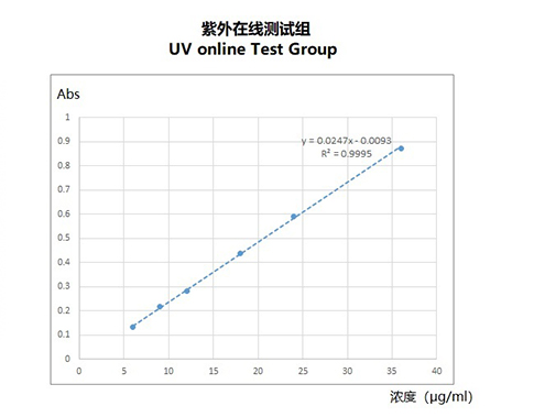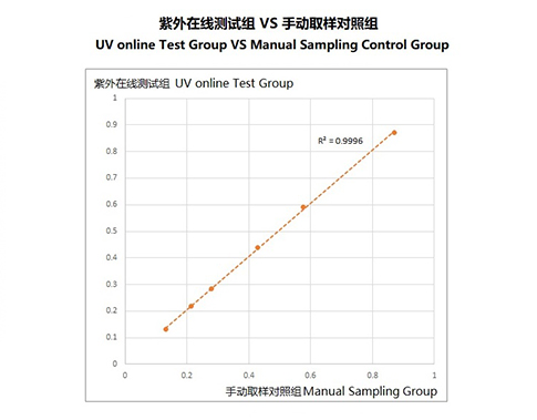 紫外在線測試結(jié)果呈現(xiàn)優(yōu)秀的線性相關(guān)性,R平方值為0.9995,與手動(dòng)取樣對照組(0.9999)無顯著差異。