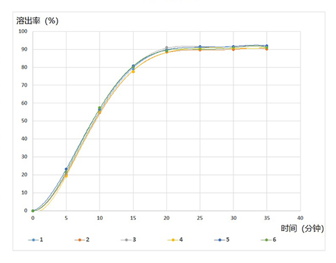 使用銳拓在線紫外自動(dòng)檢測溶出系統(tǒng),設(shè)定溶出參數(shù):籃法;轉(zhuǎn)速:100RPM;溶出介質(zhì):900ml純水;溫度:37.0℃;紫外檢測波長:257nm。樣品自動(dòng)同步投藥后,系統(tǒng)每隔5分鐘自動(dòng)取樣并執(zhí)行在線紫外檢測,通過吸光度結(jié)果換算出樣品溶液的濃度,并進(jìn)一步求得其溶出率。
